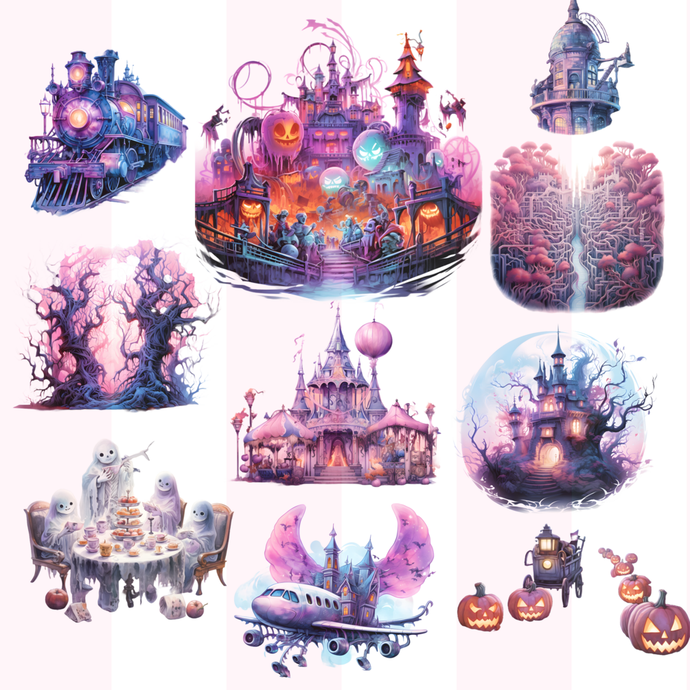 Overall, this set of Halloween clipart is a delightful and creative way to celebrate the spooky holiday. The pastel colors and whimsical designs make the images both spooky and ethereal.